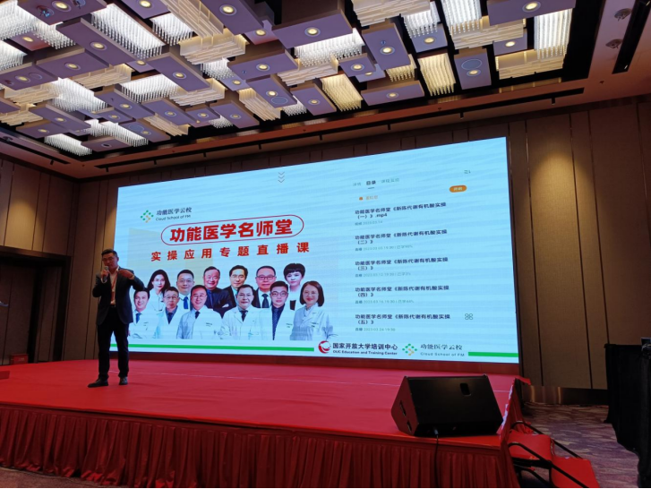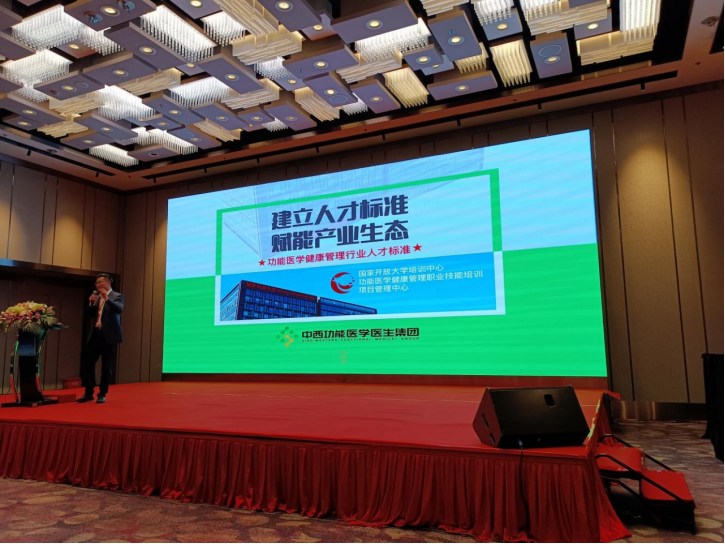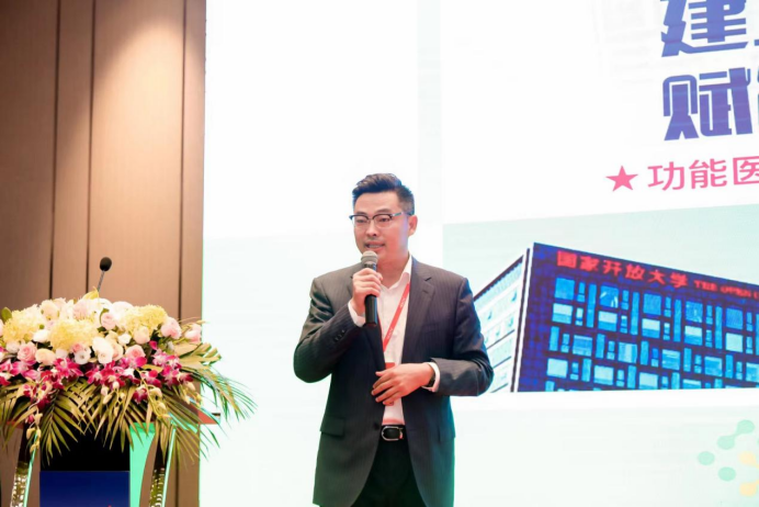 圆桌论坛引起了大家对系统化培养人才的极大热忱。接下来,主持人邀请了国家开放大学培训中心功能医学健康管理职业技能培训项目管理中心代表李新征先生上台发表了《建立人才标准 赋能产业生态》的主题演讲。李博士从全球视野、全产业发展格局为大家阐述了人才标准和系统培养的重要性,赢得了在场观众的阵阵喝彩!